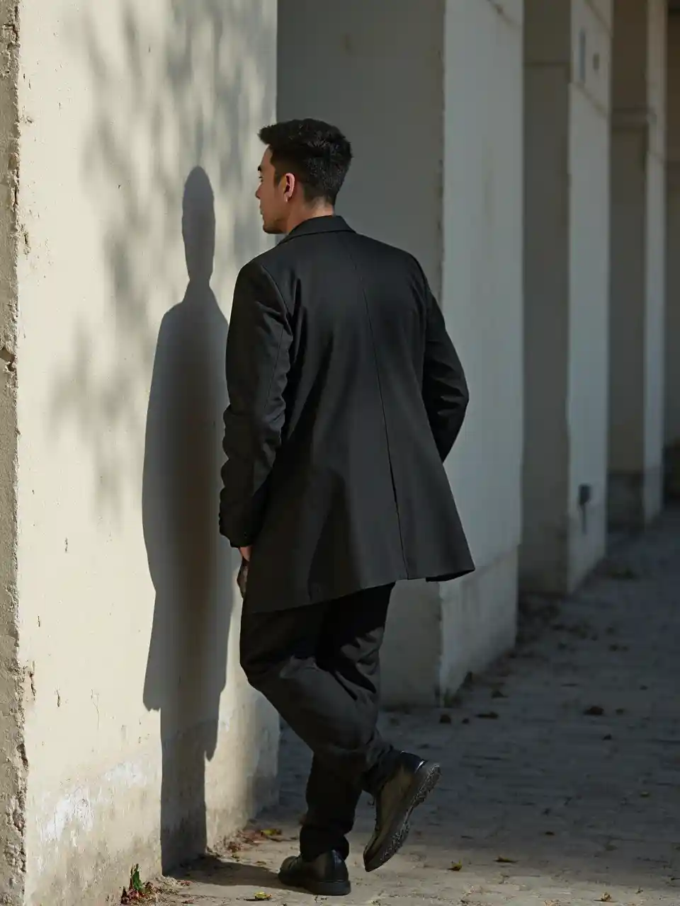 walks in nonchalant style, and turns his back to us to lean against a wall