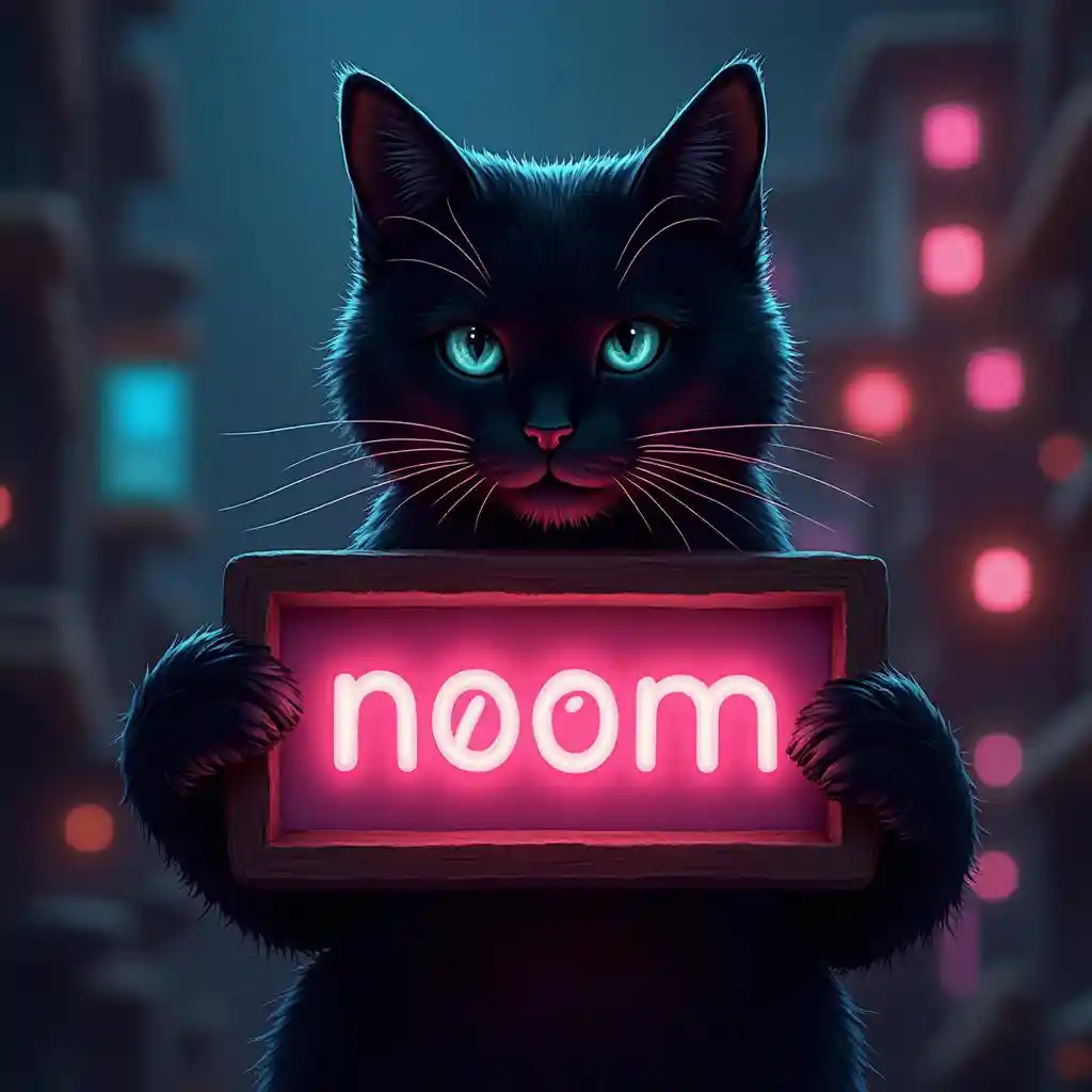 Emeryblack cat holding a neon sign with the text "nOOM"