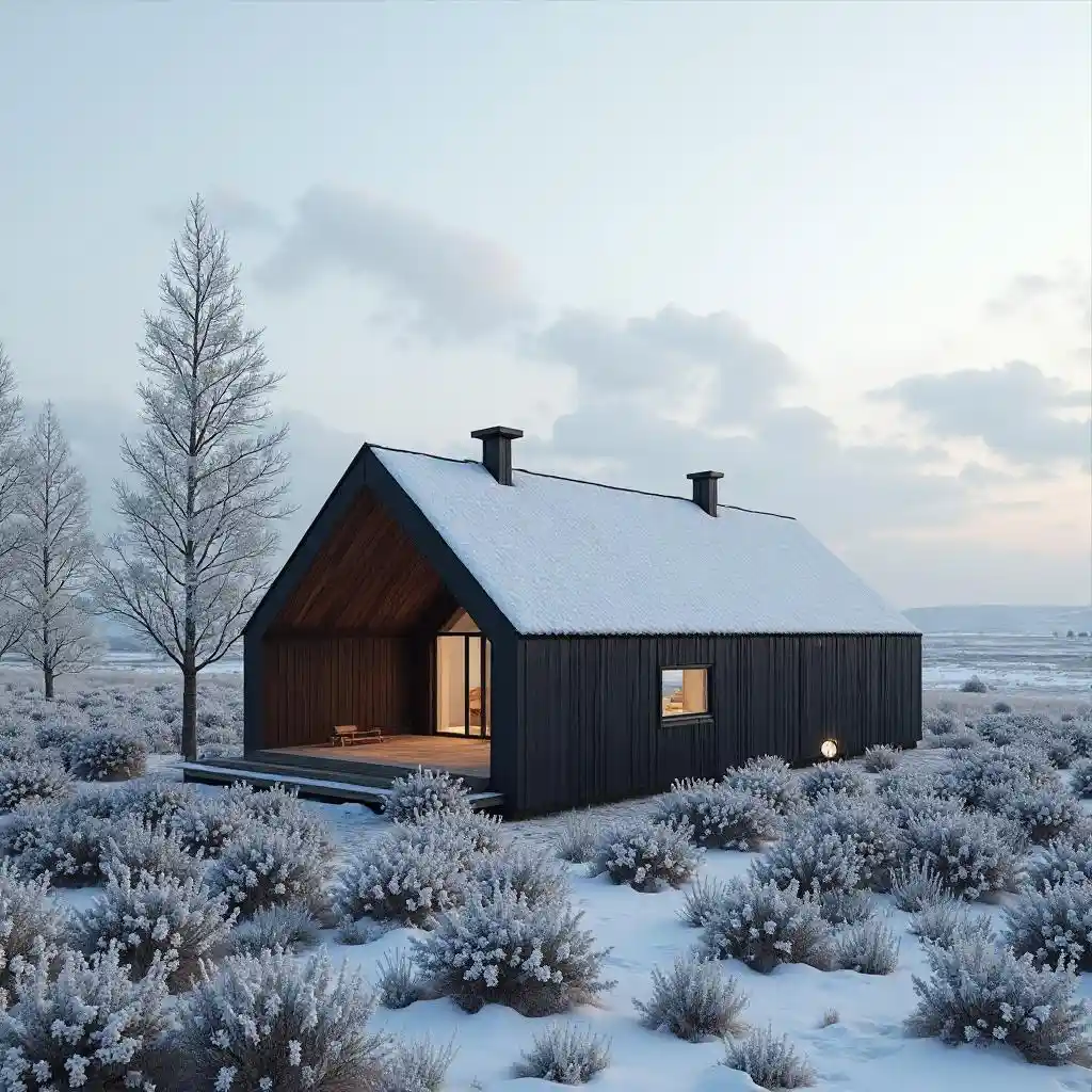 minimalistic cabin with a slanted roof, norwegian landscape