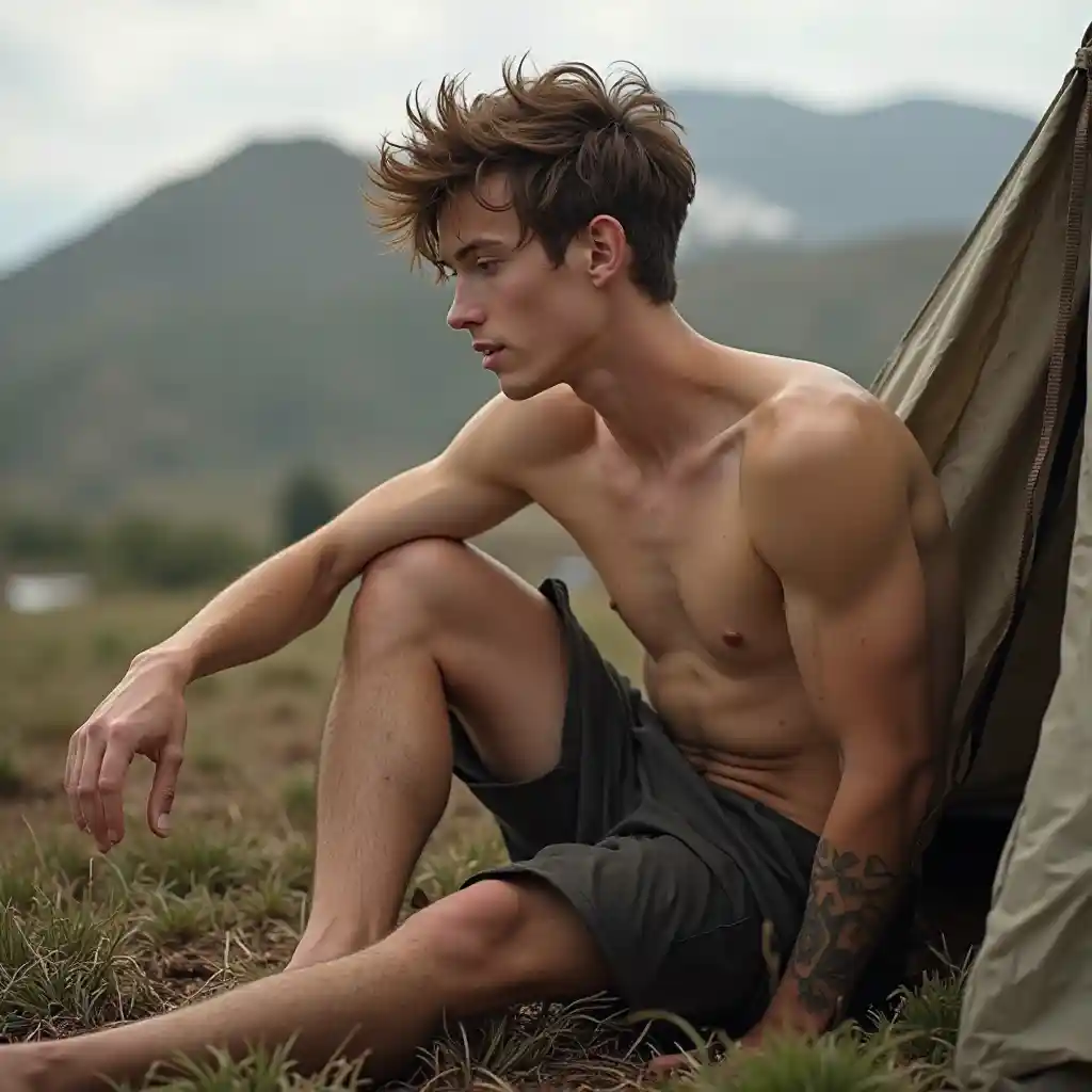 Chloevery slender ((very scrawny)) ((((veiny muscular)))) 18yo smiling norwegian gays boyrunners sitting before tent profile view