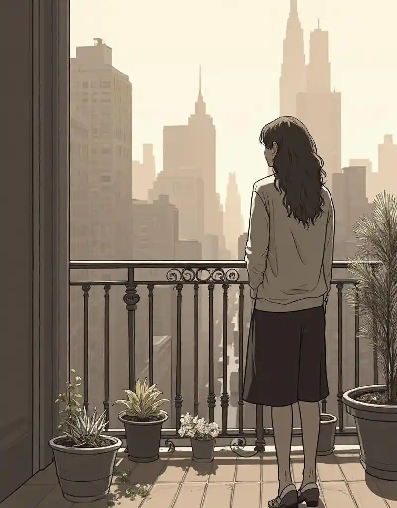 Sepia Illustration of Woman on NYC Balcony