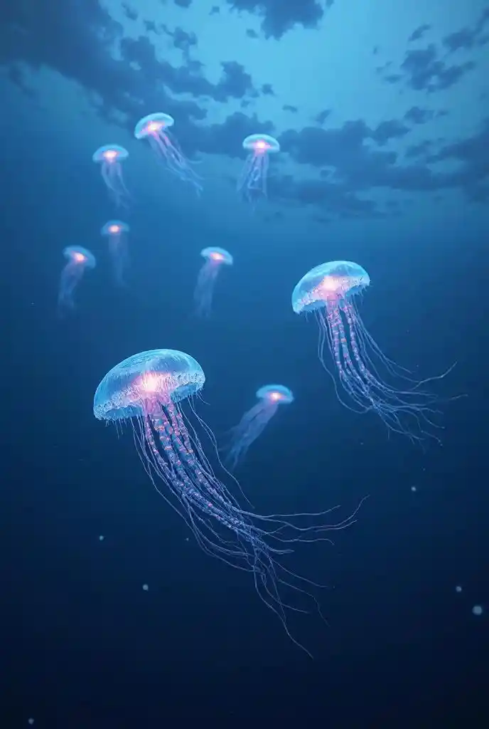 Picture a vast, otherworldly ocean under a twilight sky, where transluminescent creatures glide gracefully through the water. These beings, resembling jellyfish