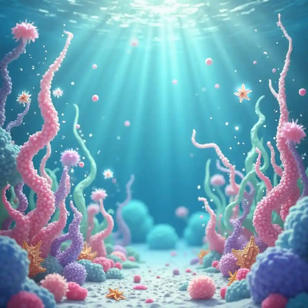 A breathtaking underwater masterpiece featuring fluffy, pastel-colored seaweed gracefully dancing in the ocean currents. Each strand of seaweed is soft and cloud-like, gently swaying as if performing a synchronized ballet. Their colors shift between dreamy pinks, baby blues, soft lavenders, and mint greens, glowing faintly as bioluminescent particles swirl around them. Tiny, chibi-style sea creatures, such as mini jellyfish, glowing seahorses, and adorable starfish, float alongside, adding a whimsical charm to the scene. The ocean floor is covered in iridescent sand, reflecting the soft glow from the enchanted seaweed, while the background fades into a blurred, ethereal blue with shimmering bubbles rising toward the surface. The composition captures the delicate flow of movement, with each strand of seaweed twisting and curling in a graceful dance, illuminated by gentle rays of light filtering through the water. The atmosphere is serene, magical, and full of warmth, evoking a sense of underwater fantasy. Rendered in 8K ultra-high resolution, with intricate textures, delicate light reflections, and a perfectly blended pastel color palette, this artwork embodies whimsy, tranquility, and dreamlike beauty