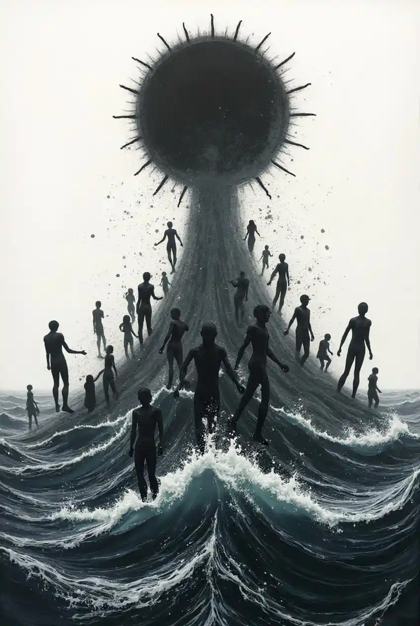a crowd of hundreds of black humanoid beings levitate, rising from the ocean, emerging from water , riso graph, black sun, white sky