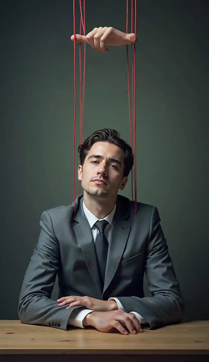 EmmaA depressed office worker in a gray suit being controlled like a marionette by red strings from the ceiling, corporate puppet, emotionless face, sitting at a de