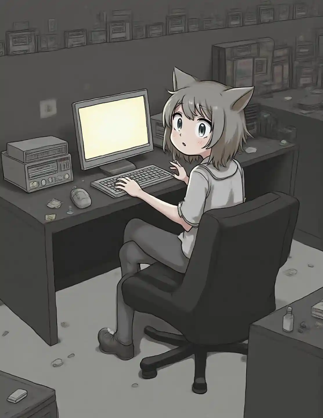 Cat Ear Girl in Dark Messy Office