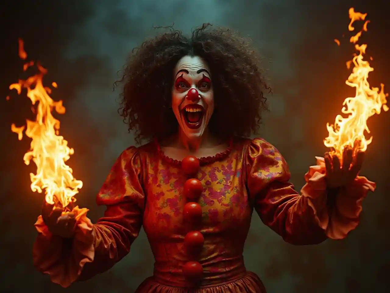 Williamoprah winfrey as a fire breathing scary clown with halloween props