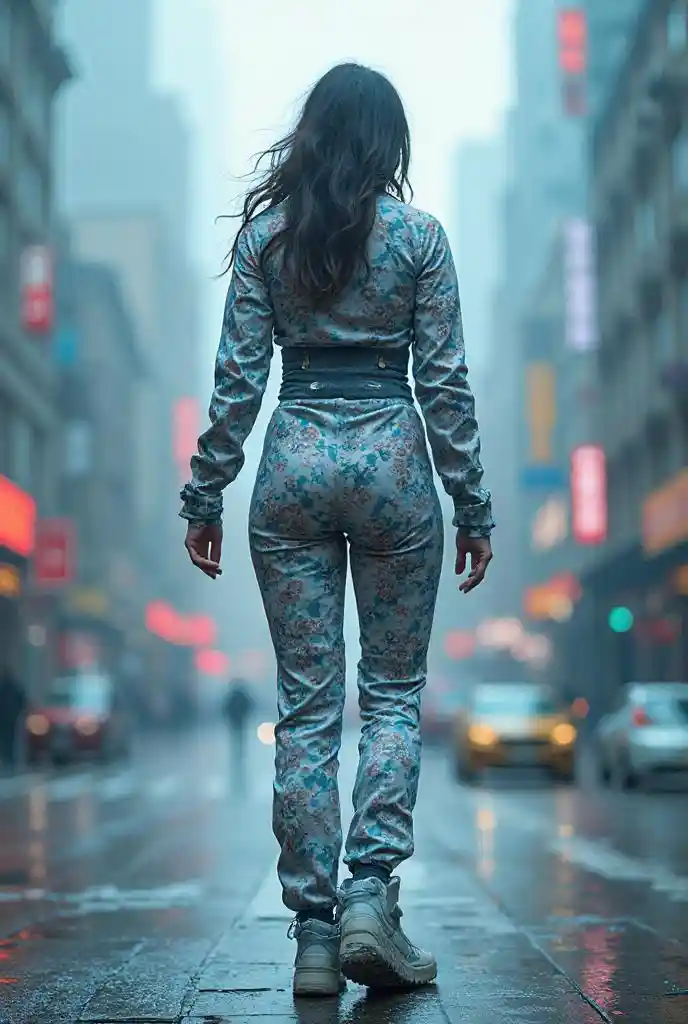 Buildings、girl in optical camouflage suit、The lower body is transparent due to optical camouflage, showing the cityscape in the back、