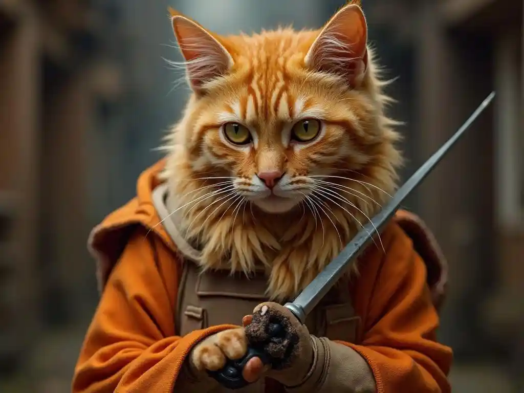 orange cat a trabajar, Puss in Boots working as a Jedi in Star Wars, Final Detail , Masterpiece, photorealistic portrait, award-winning photograph. orange ca