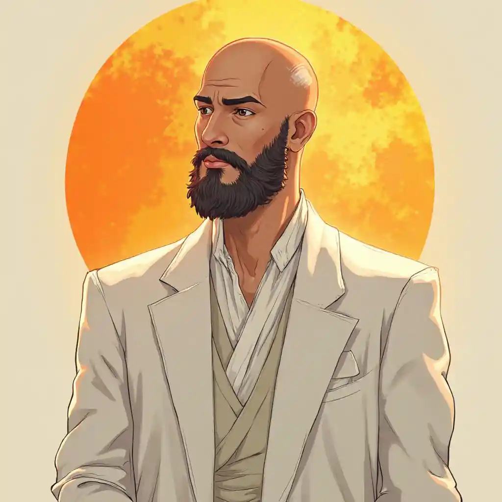 Tinawarrior with orange sun and white suit and whit e skin and beard