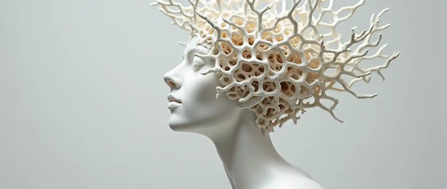 image showcases a surreal, abstract sculpture of a human head, intricately designed to resemble a delicate coral or organic lattice structure. The figure is depicted in profile, with the surface of the face and neck covered in a network of thin, flowing, branch-like elements. These interwoven tendrils appear to grow naturally out of the head, extending outward and upward, creating a crown or halo effect of complex, porous patterns. The material of the sculpture is stark white, smooth and glossy, giving the impression of bone or polished porcelain. The organic, almost alien design contrasts with the otherwise realistic human form, producing a haunting, ethereal aesthetic. The open spaces within the structure allow light to pass through, casting intricate shadows that add to the depth and intricacy of the sculpture. The facial features are serene and calm, with a gentle expression that contrasts the chaotic, branching design enveloping the figure. The artwork evokes themes of transformation, nature, and the blending of human and organic elements, making the figure look almost like a being from a futuristic, bio-organic world.