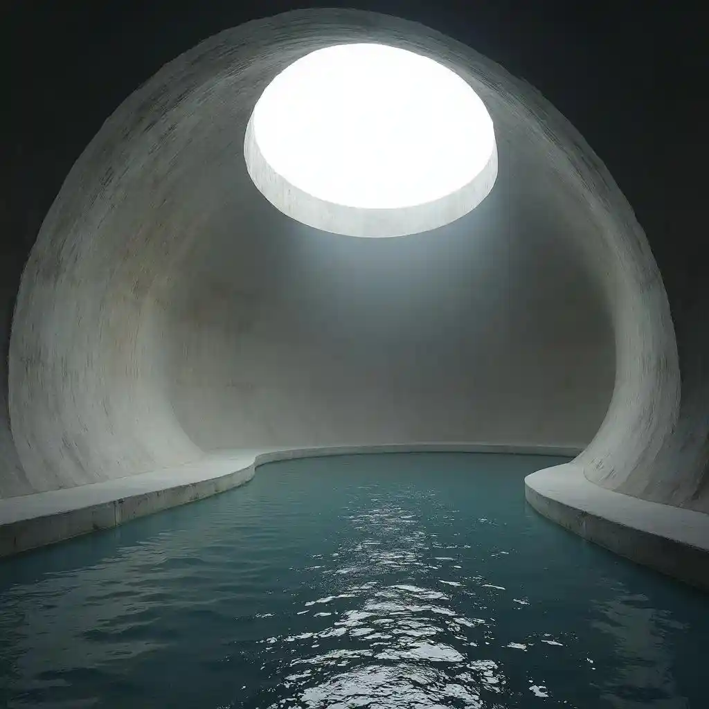 "The interior of the structure is enormous and dimly lit, with light only coming from outside through the upper edges of the building. The space is shaped like an unfilled oval pool, with curved inward walls and an open ceiling. The image should be taken from inside the structure, capturing the vast empty interior and showing part of the curved upper section where the light is coming in from outside."