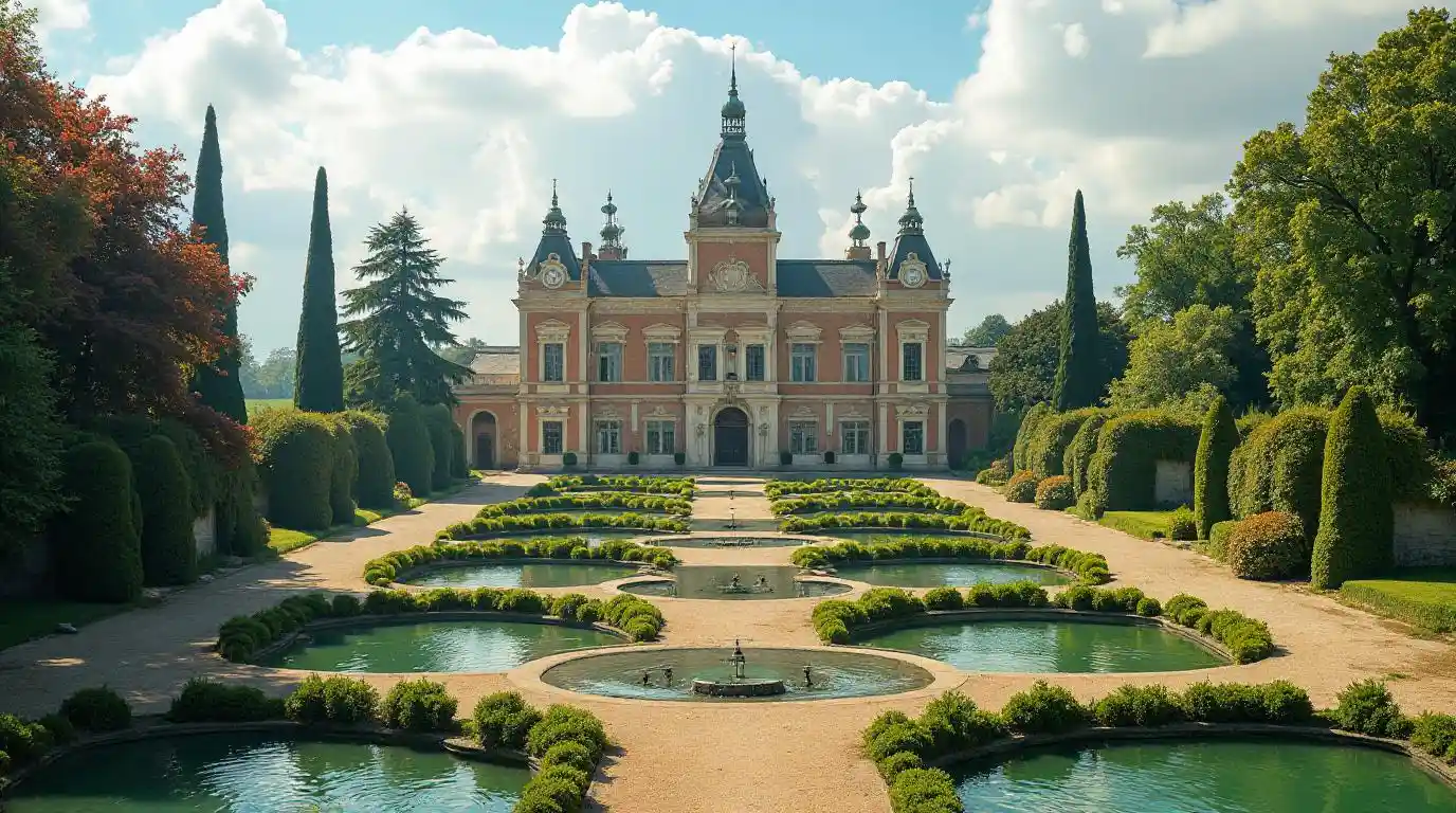 BraydenAn ornate palace surrounded by moats and lush manicured gardens.