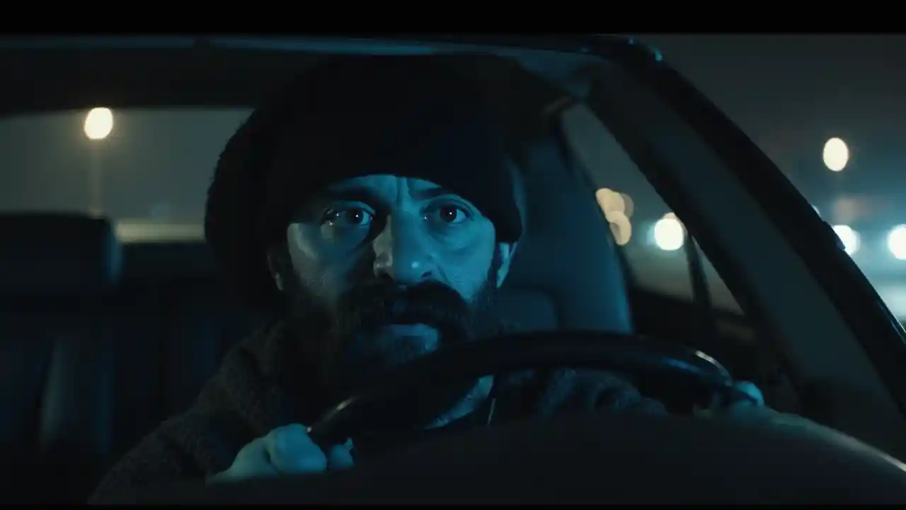 Papa Smurf as a thug wearing all black, black beanie, serious face, half-closed eyes, tired, dilated pupils, and a relaxed expression, driving a getaway car, realistic, nighttime dark, grainy low-quality photo with flash effects,