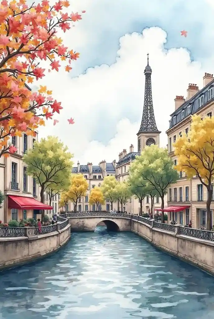 France Paris cityscape painting, ((watercolor:1.2, watercolorの滲み:1.2, Thick outline, picture book touch )), Hand Drawn Dream World, masterpiece, best qualit