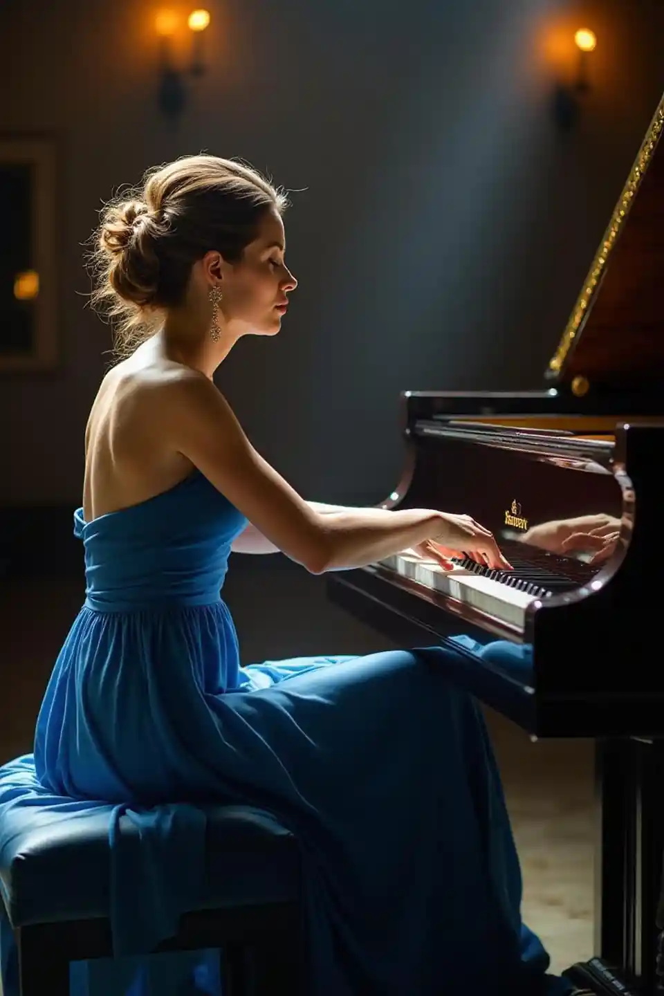 JoannaA woman in a blue dress passionately playing the grand piano,Passionate in a pose where you can hear a beautiful melody,The bright lights draw her attention,rea