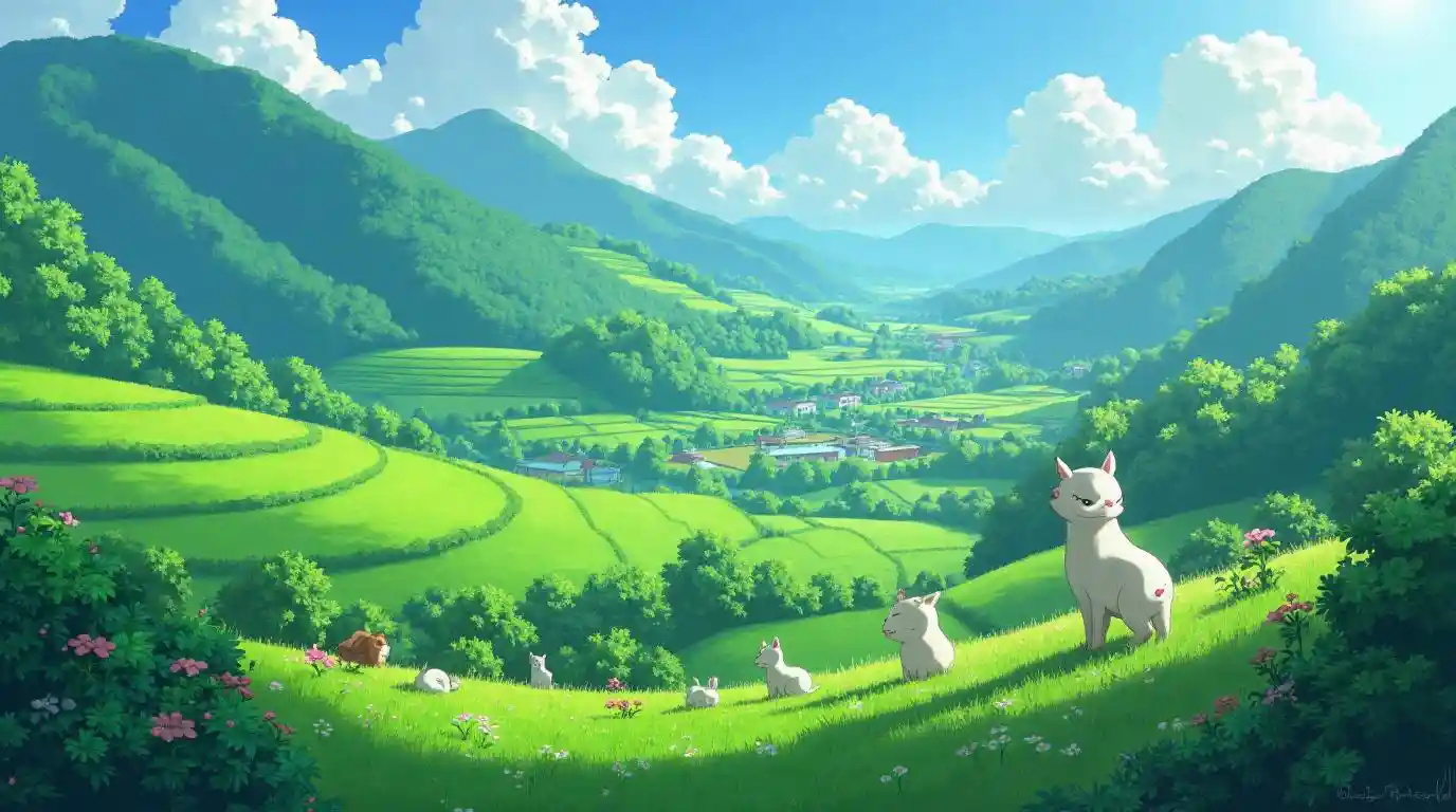 Lush terraced farms, guarded by spirit animals, in a serene anime pastoral style.