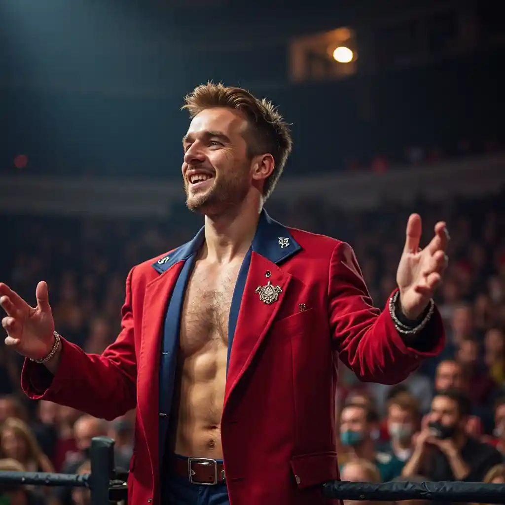 Daniela man in his 30s at westlemania in the middle of the ring looking at the crowd, very patriotic and entertaining