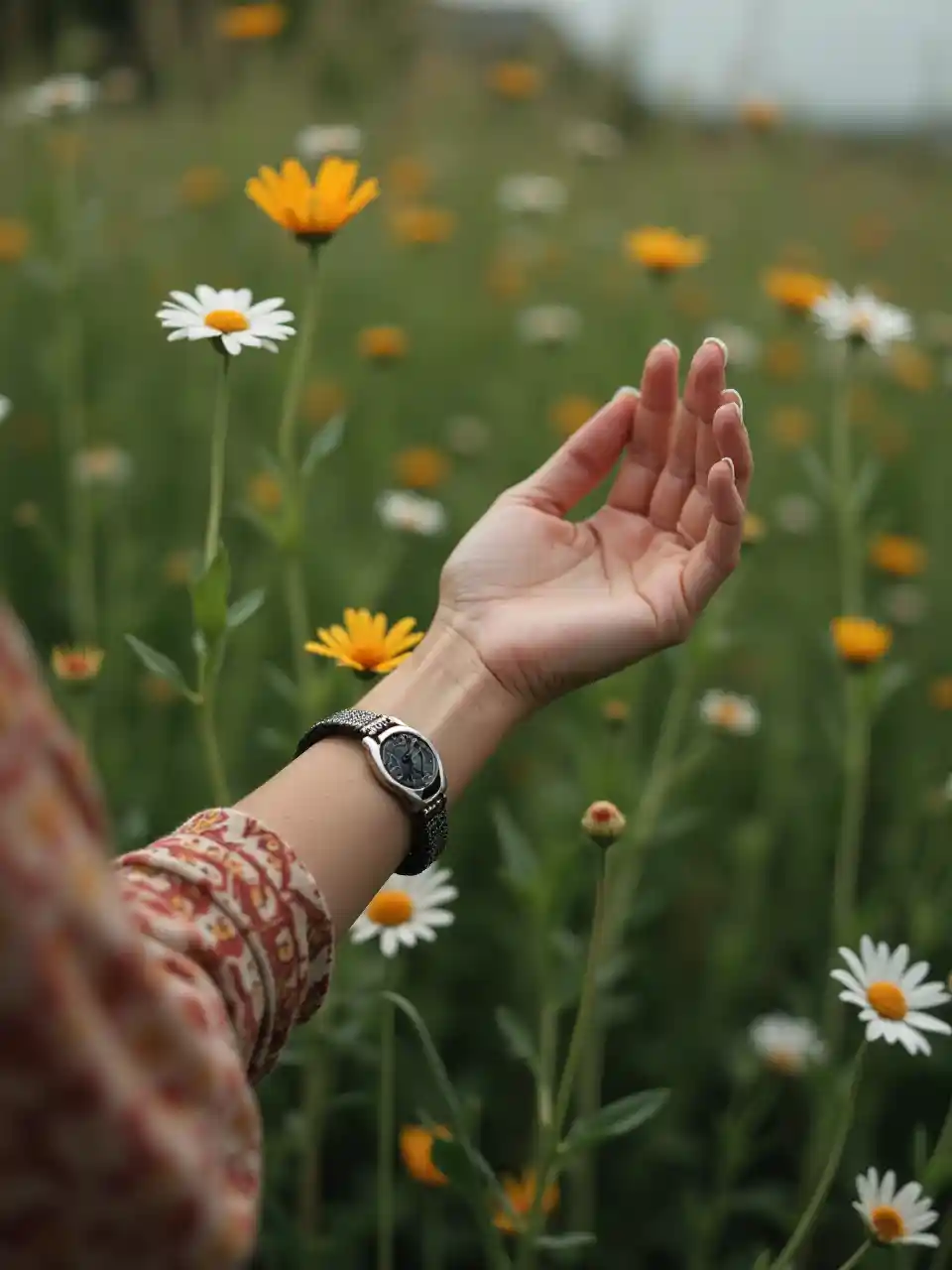 A slow camera pan of the arm and hand, with the bracelet kept in focus at all times. The flowers and grass in the background is slowly moving in the slight wind. Everything feels peaceful and easy.