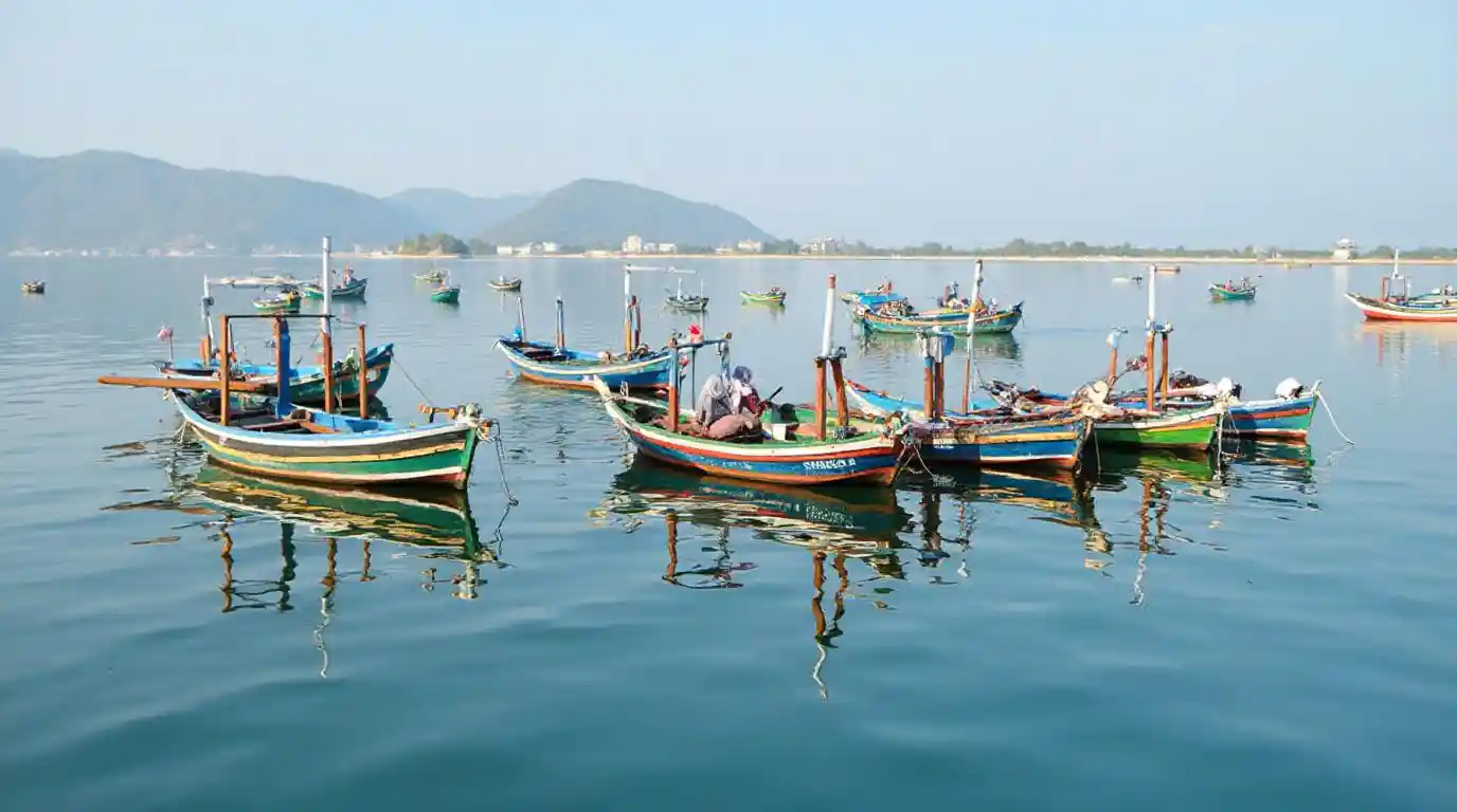 A tranquil bay with colorful fishing boats anchored, their reflections mirrored in the still water.