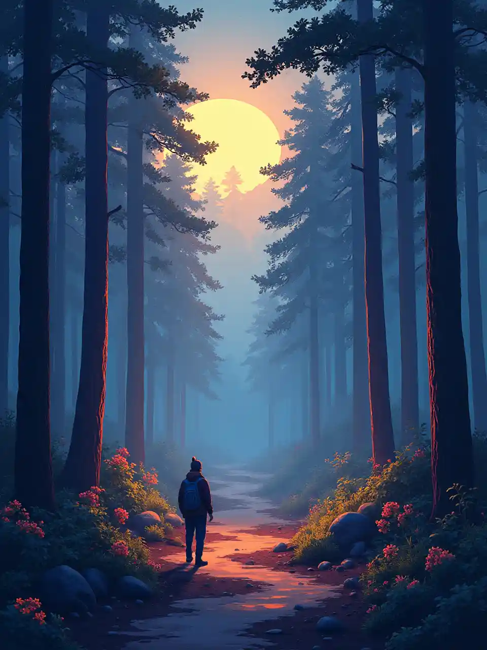 LeviUsing only the colors in the reference image, create a landscape of an peaceful and relaxing glowing forest with a single human exploring