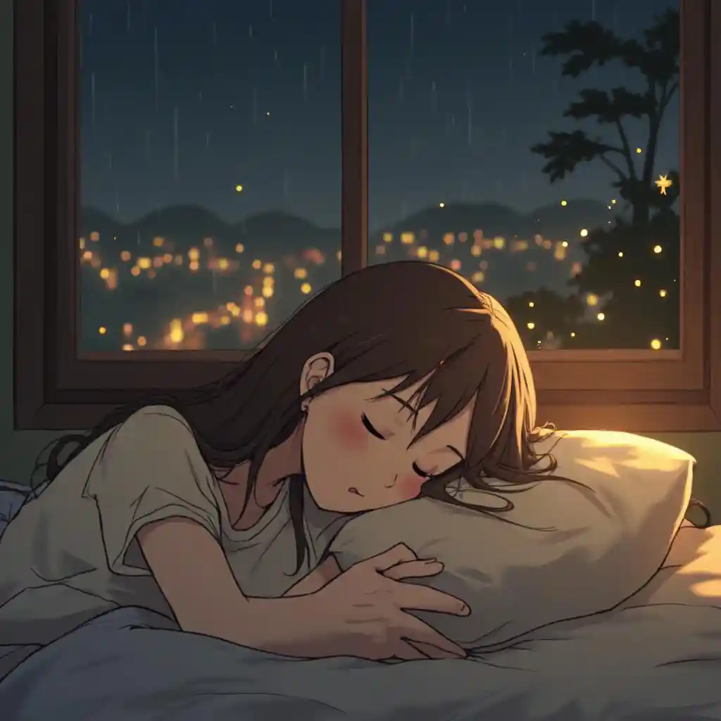 A peaceful scene inspired by the dreamy and whimsical style of Hayao Miyazaki’s animations. A young woman with long, flowing brown hair rests her head gently on a soft, plush pillow as she sleeps soundly. Her face is serene, with a soft, rosy blush, and her expression radiates calmness and innocence. She wears a light-colored, loose, comfortable top. The room is dimly lit with a warm, golden hue, creating a cozy atmosphere. Through the large window beside her bed, raindrops softly tap against the glass, adding a soothing rhythm. The rain is illuminated by the warm glow of distant city lights, sparkling gently in the night. Outside, faint shadows of trees sway softly in the wind. Near her pillow, tiny floating sparkles of light add a magical touch, as though the room is subtly enchanted. The overall mood is tranquil and comforting, with a sense of nostalgia and wonder, capturing the delicate, ethereal beauty typical of Miyazaki’s film style.