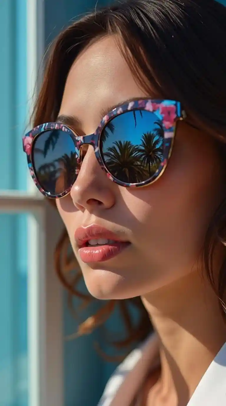 photography, harri peccinotti style, close up on sunglasses, window blinds reflections, palm tress reflections, mirror, with blue, white and red,