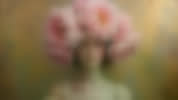 WyattBeautiful girl with 5 big peonies dirty pink and white colors with a lot of petals in her head oil painting floral art still life baroque style golden hues fine art