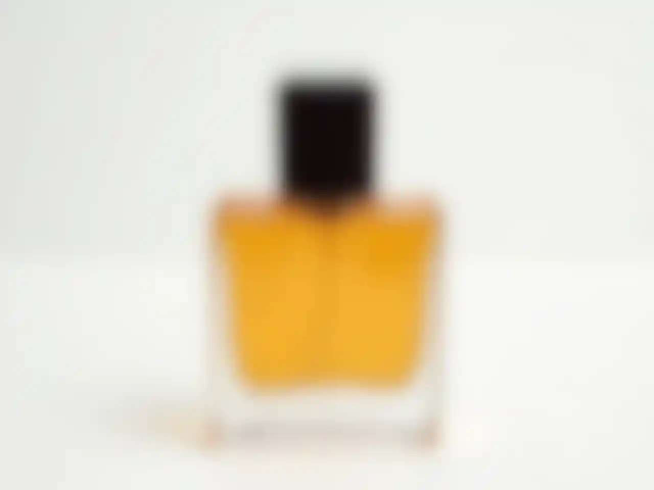 A perfume bottle, plain, square, with amber tinge. It has a square, black, wooden cap. It sits against a plain white background.