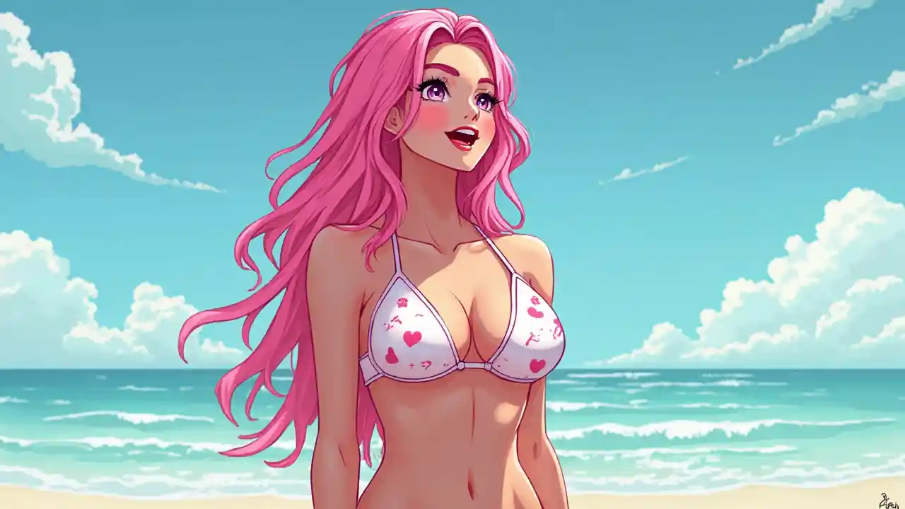 (beach day), (pixel art), detailed, torso, swin suit, bright eyes, perfect skin, action pose, bikini, pink, american patriotic, fun, (full body sexy beach girl with pink hair photo), sexual theme, woman, portrait, smile, laugh, open mouth, (upper body, bust shot, looking away:1.1), neon hair