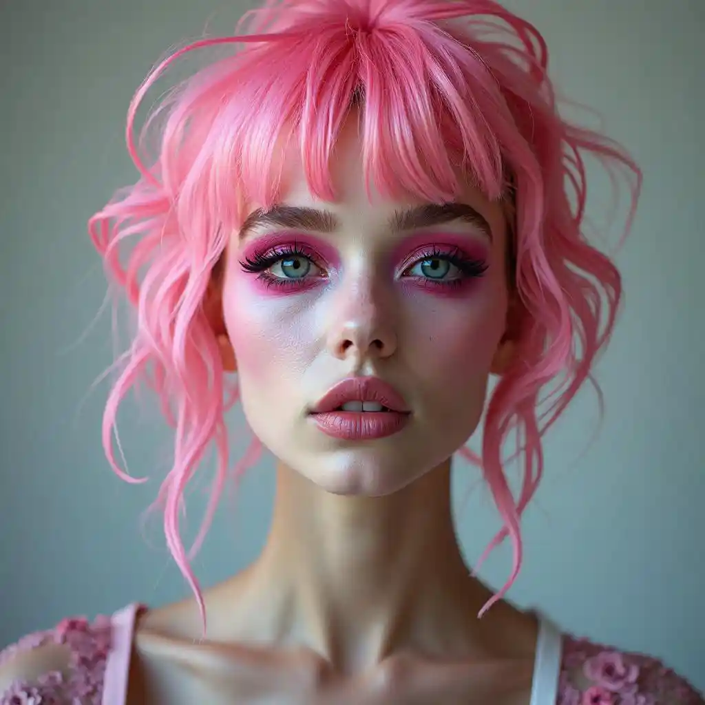 Isabellasurreal front-view portrait of a fashion model with heavy make up and pink hair.