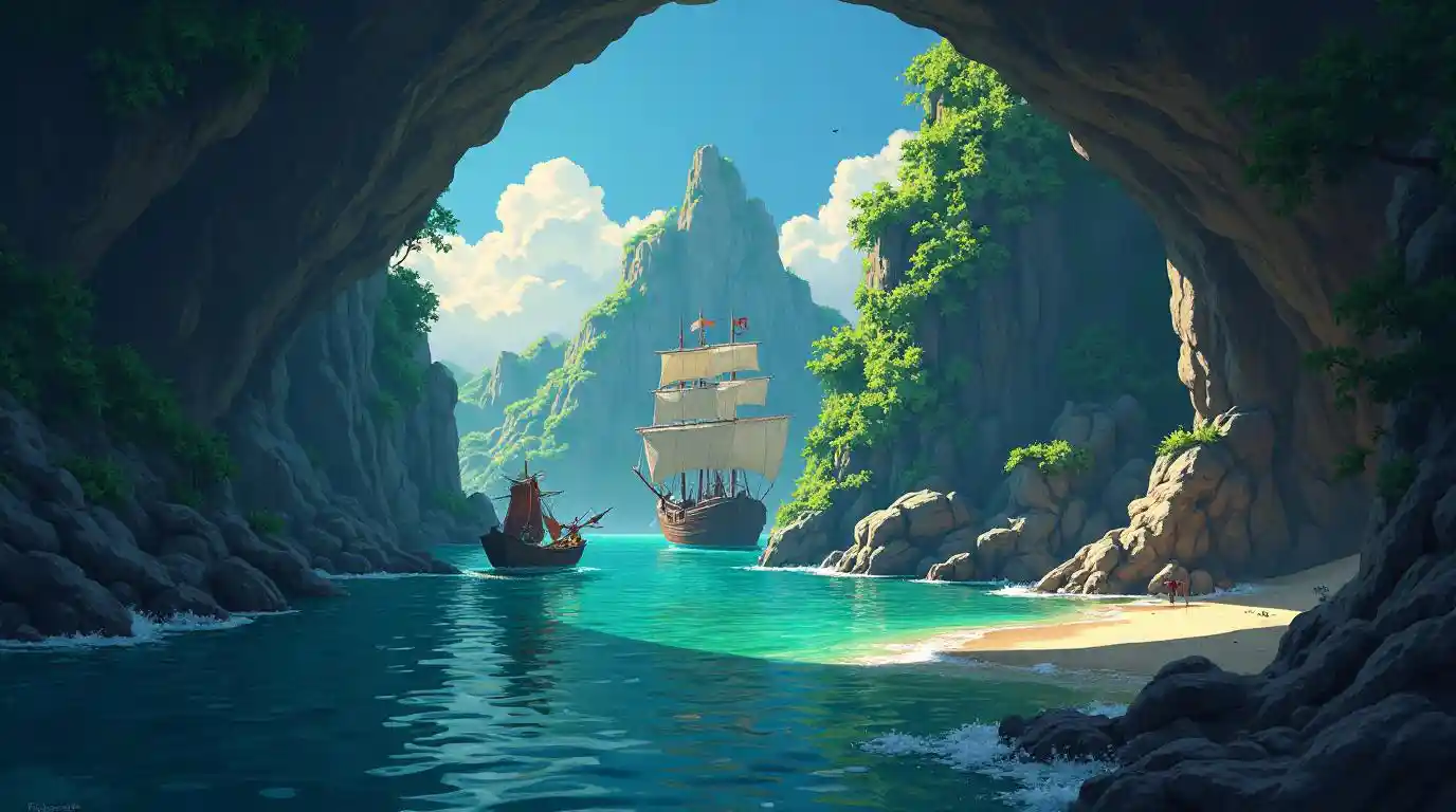 Secluded cove, pirates trading magic artifacts, resonating with adventure anime themes.