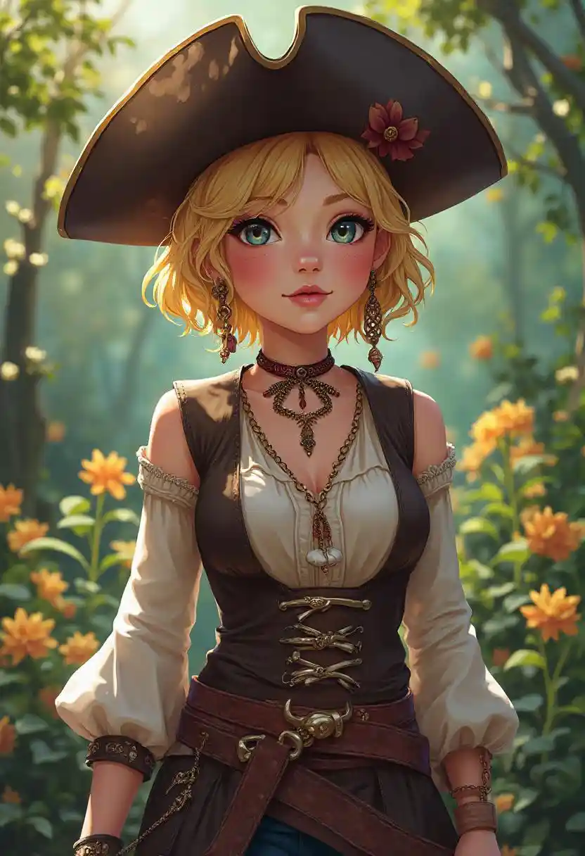 Colten(((1 woman, blonde, short hair, pirate, pirate outfit and hat, midsummer hippie, belle delphine, hippie girl, dark cute, 1 9 8 0 s flower power hippie, hippy, d