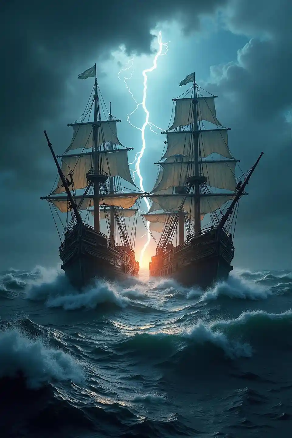 rubylynThe collision of two huge pirate ships and the war and madness of many pirates,In a situation where lightning falls from dark clouds and waves larger than a pir