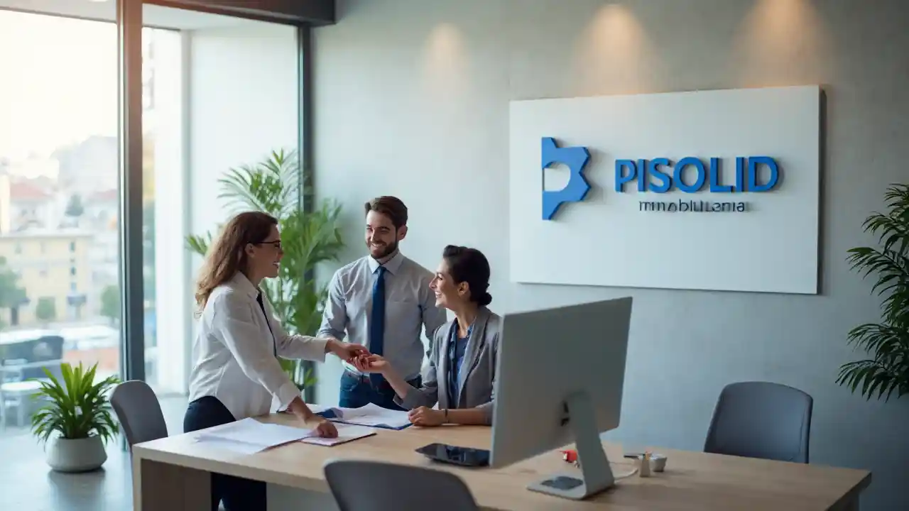 La escena se desarrolla en una oficina inmobiliaria moderna y profesional, con un ambiente luminoso y elegante. La oficina tiene grandes ventanales que permiten la entrada de luz natural, mostrando una vista parcial de una ciudad al fondo. El diseño interior es minimalista, con muebles de líneas rectas, tonos neutros como blanco, gris y madera clara, y algunos detalles en azul que combinan con los colores del logo de "PISOLID Inmobiliaria". En el centro de la imagen, hay un agente inmobiliario vestido con un traje formal (puede ser un hombre o una mujer), sonriendo amablemente mientras entrega un juego de llaves a una pareja de españoles. La pareja, un hombre y una mujer de mediana edad con rasgos típicos españoles (por ejemplo, cabello oscuro y ropa casual pero elegante), parece emocionada y agradecida. Ambos están de pie frente a un escritorio moderno. Sobre el escritorio, hay una computadora con una pantalla que muestra claramente el logo de "PISOLID Inmobiliaria" (el mismo que proporcionaste, con su diseño geométrico a la izquierda y el texto en azul). El logo también está presente en un cartel grande en la pared detrás del agente, integrado en un diseño limpio con el nombre de la empresa. El ambiente transmite profesionalismo y confianza, con detalles como una planta decorativa en una esquina, carpetas organizadas en el escritorio y un portarretratos pequeño que añade un toque personal. La iluminación es cálida pero profesional, con luces empotradas en el techo. La composición de la imagen está equilibrada, con el agente y la pareja en el primer plano, el escritorio y la computadora como elementos centrales, y el fondo que añade profundidad con los ventanales y el cartel. Los colores predominantes son blanco, gris, azul (del logo) y algunos toques de madera clara, creando una atmósfera moderna y acogedora.
