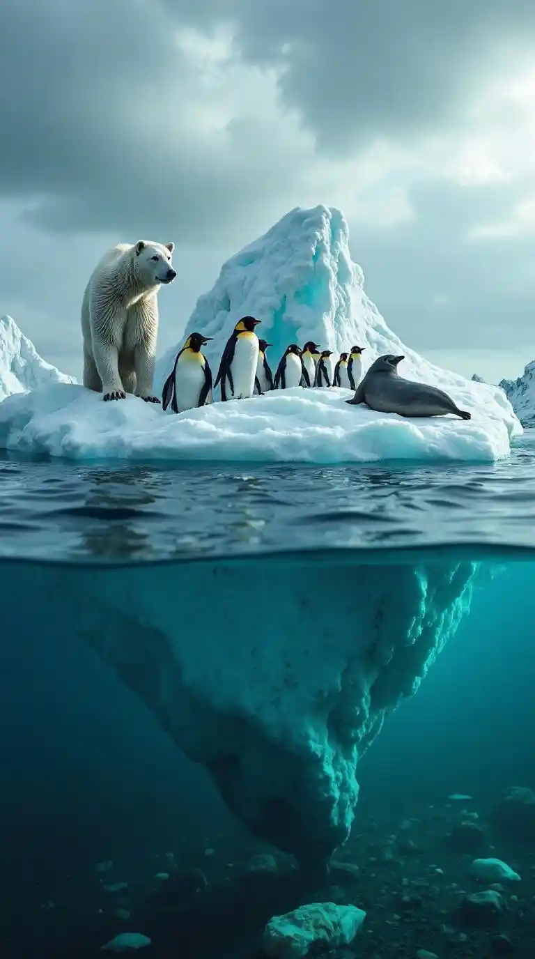 A cinematic, hyper-realistic shot of an iceberg floating in a polluted ocean. A polar bear stands dominantly on the left, its fur wet, realistic texture. Next to it, a family of penguins huddled together, and a resting seal is on the right. Each animal has detailed fur and skin textures. Below the surface, submerged in the icy blue waters, visible layers of plastic waste and debris, emphasizing environmental decay. Overhead, stormy clouds with a dramatic, overcast atmosphere. The image has a cinematic lighting, high dynamic range, and deep focus capturing both surface and underwater clarity, perfect compositional balance