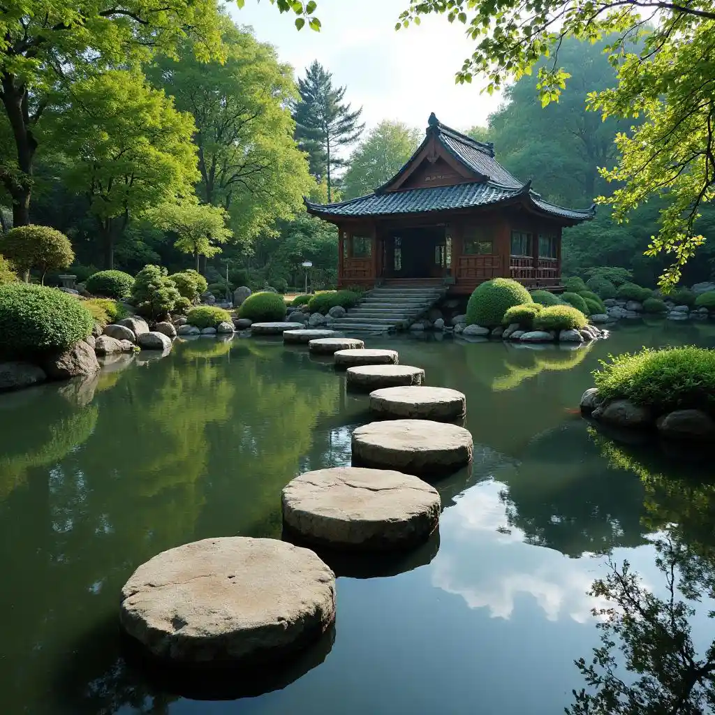 Stepping stones across a tranquil pond, leading to a tea house.