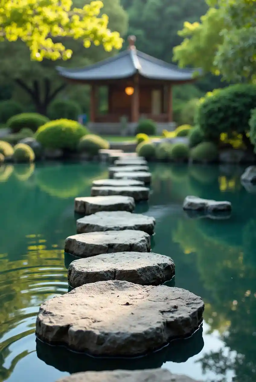 LincolnStepping stones across a tranquil pond, leading to a tea house.