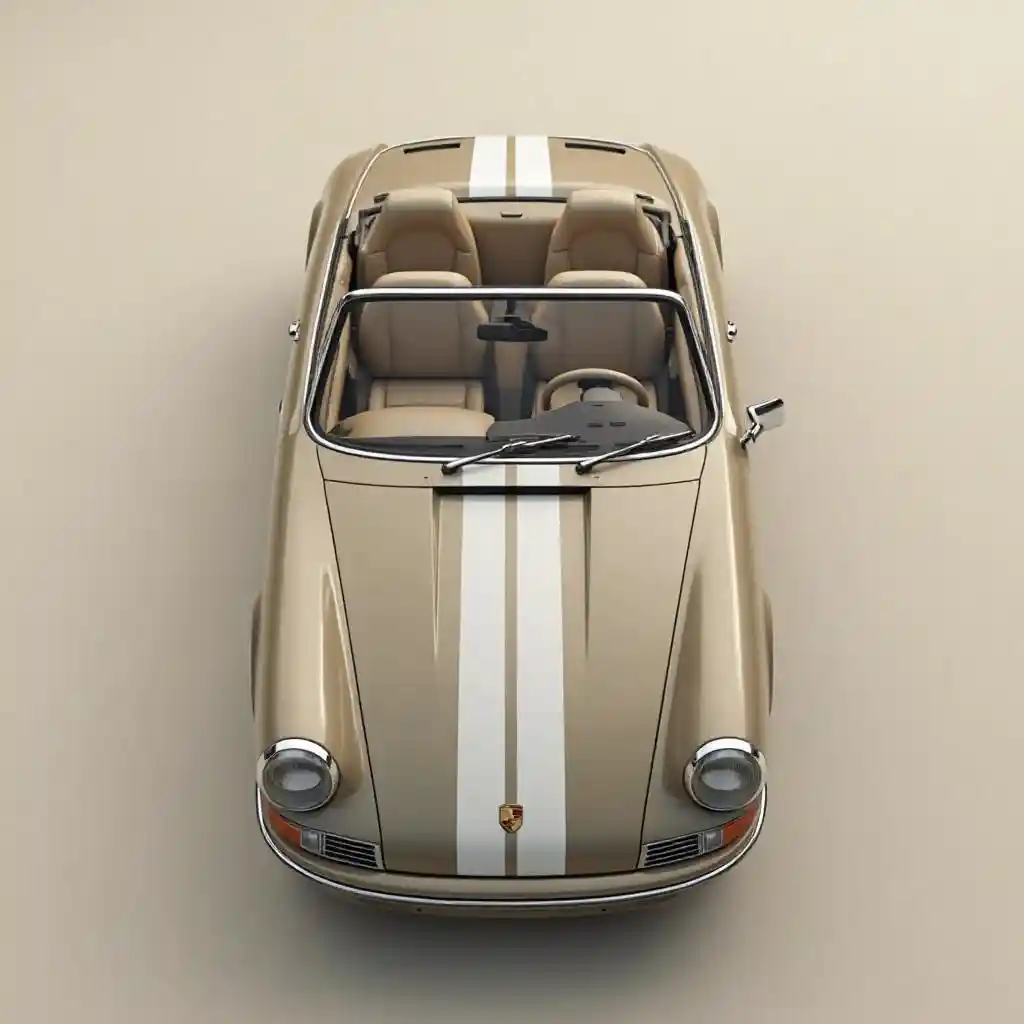 JoannaPorsche 911 khaki color with two white stripes along the body with a beige leather interior, top view, neutral background