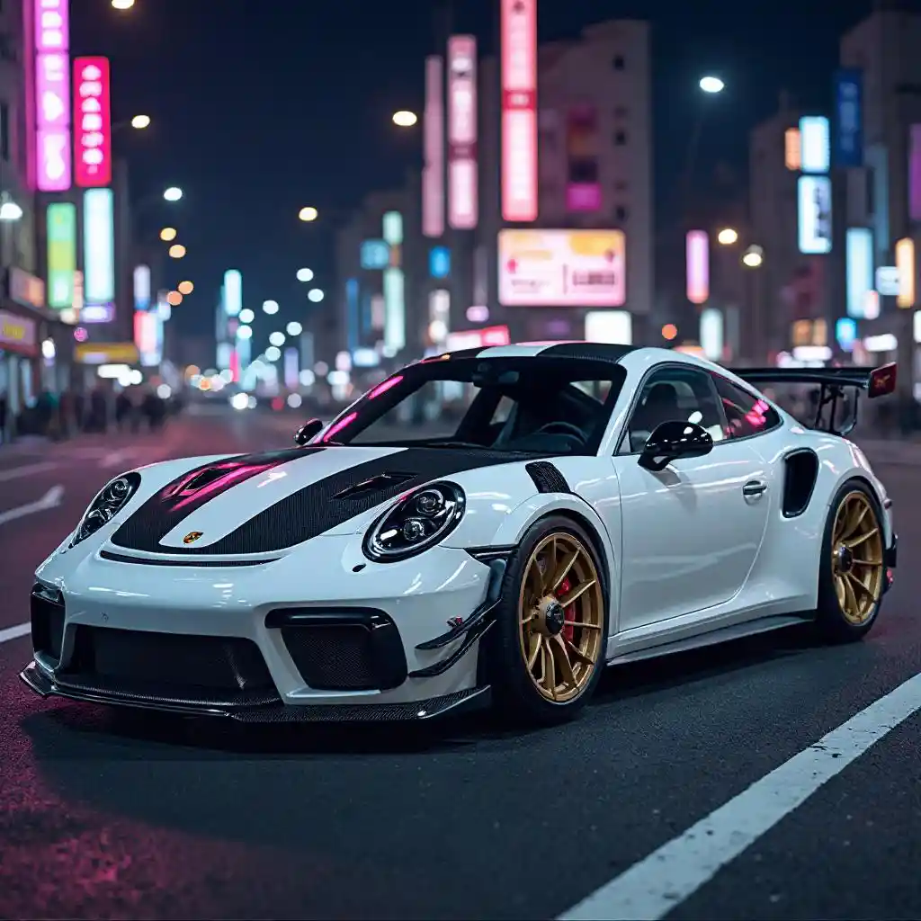 PaisleyWhite Porsche 911 GT 3Rs,tuned,bodykit,lowered,golden rims,carbon spoiler,some carbon parts,,nice Headlights,Night,Tokio,pink and blue neon signs in background,realistic