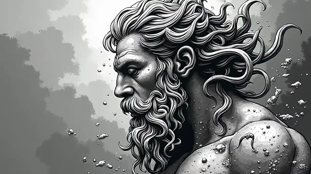 A vector art of a Poseidon head tattoo, low rise angle, epic battle, portrait, black and white