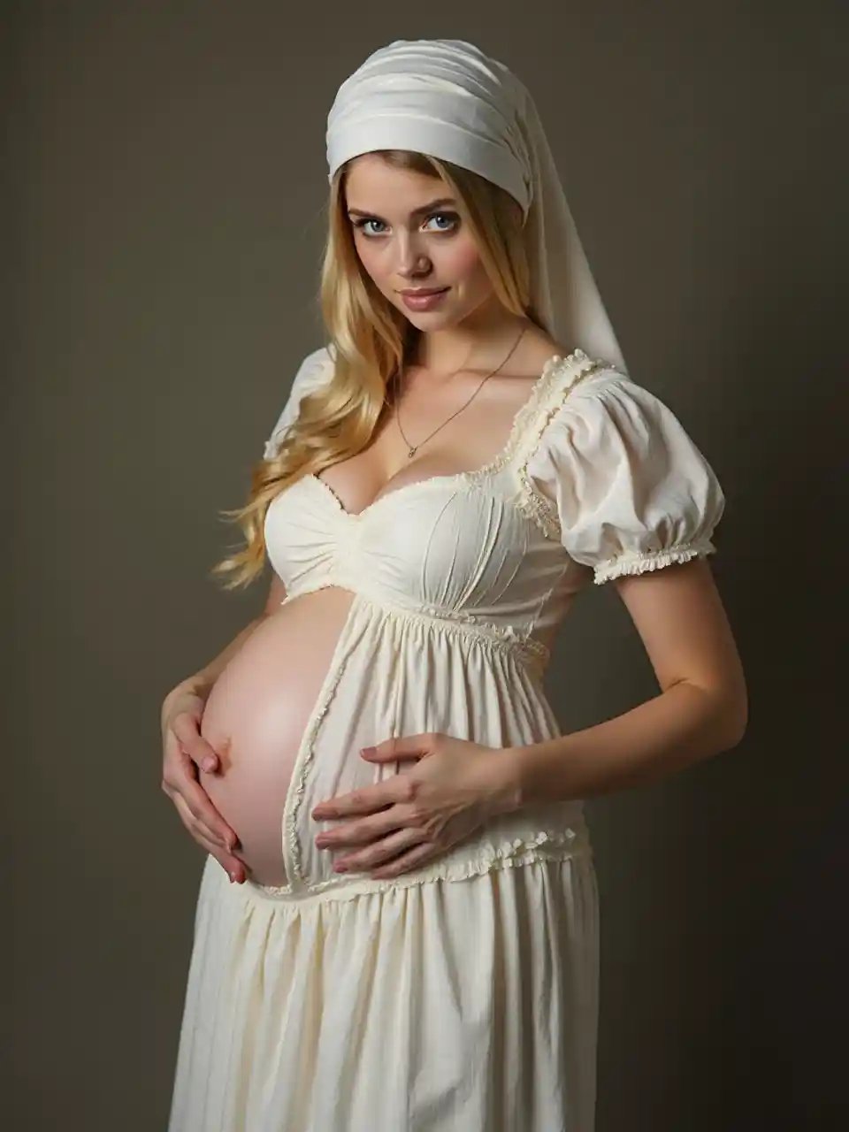JocelynYoung Milkmaid. Heavily pregnant. Blonde . Gigantic belly. White headscarf