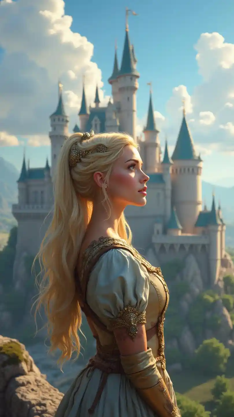 beautiful princess, Gorgeous blonde, Woman looking at the sky from the roof of a huge castle, unfocused gaze, Expression longing for something, Detailed descrip