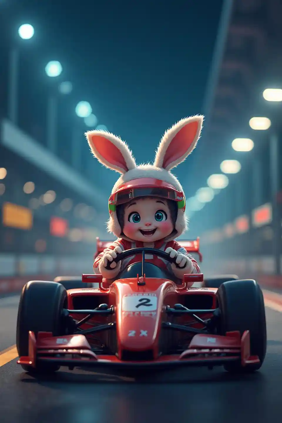 Zoephotorealistic portrait of night racing scene, cute (baby rabbit) racer,(driving a F1 car:1.5),(happy smile), (riding on F1 cart:2.0), (in racing circuit),(dyna