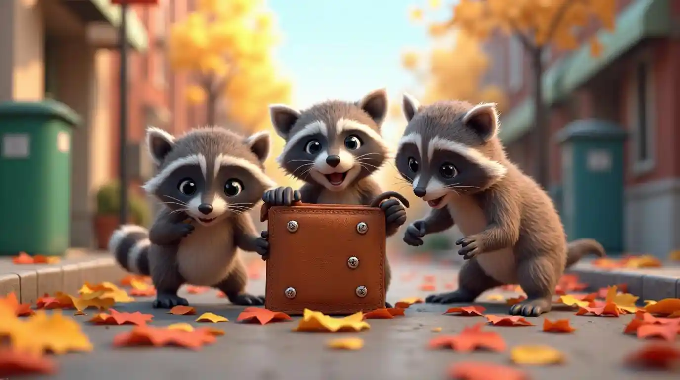 A playful 3D scene featuring curious raccoons exploring a stylish wallet. The raccoons are animated with exaggerated expressions, surrounded by colorful leaves, trash cans, and urban elements, emphasizing their mischievous nature. The wallet is prominently displayed, showcasing its leather texture and design in a dynamic perspective. The setting is vibrant with lively colors and a sense of fun, capturing the whimsical interaction between raccoons and their newfound treasure.