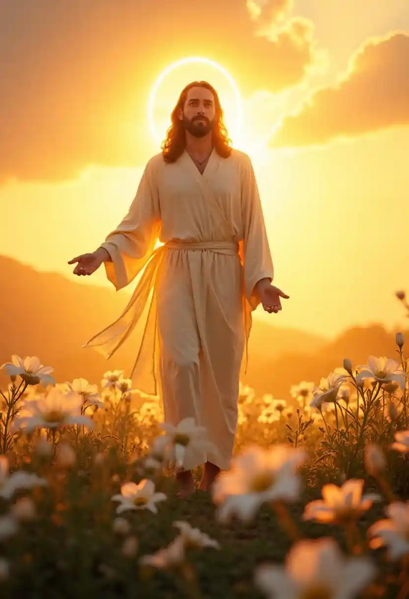 Jesus stands at sunrise on a hill of blooming lilies, wearing a radiant robe made of light and petals. A soft golden halo glows behind his head like a rising su