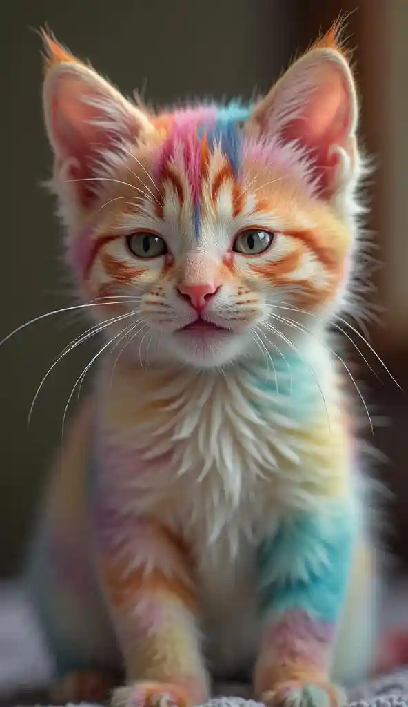 affectionate is cute cat, rainbow-colored fur을 가진 cat, cat,affectionate,is cute,rainbow-colored fur,4K,HDR, Realistic Description ,photorealistic,professiona