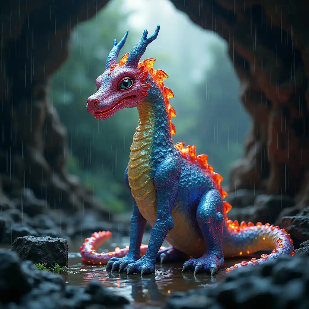 glasss rainbow dragon sitting in his cave with the rain in front of him