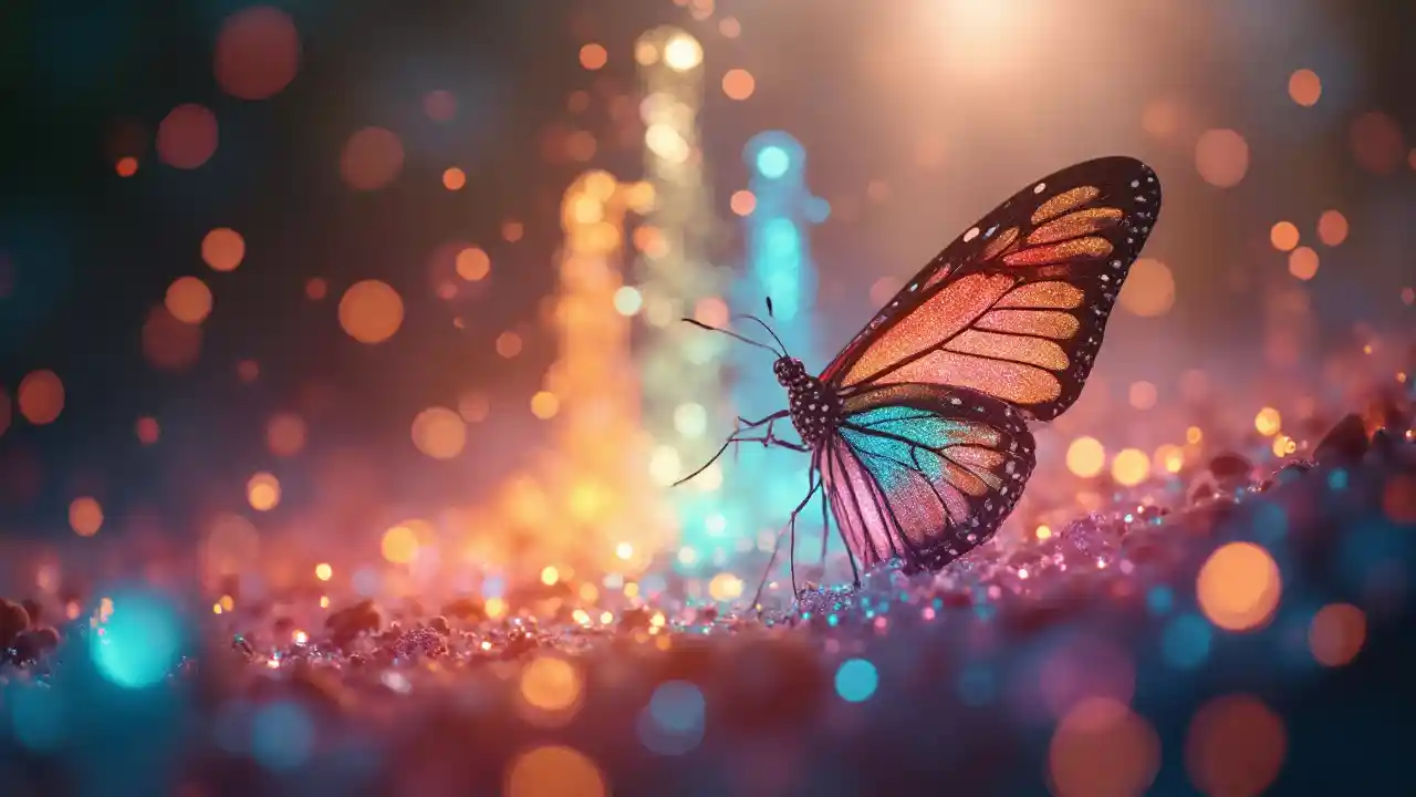 cinematic photo a radiant rainbow fountain bursts forth from a kaleidoscope of glittering gemstones, as a majestic butterfly with iridescent wings and a trail of sparkling stardust unfurls its delicate beauty amidst the shimmering mist, surrounded by a chorus of singing fireflies and a procession of gleaming lanterns carried by dancing clouds. . 35mm photograph, film, bokeh, professional, 4k, highly detailed