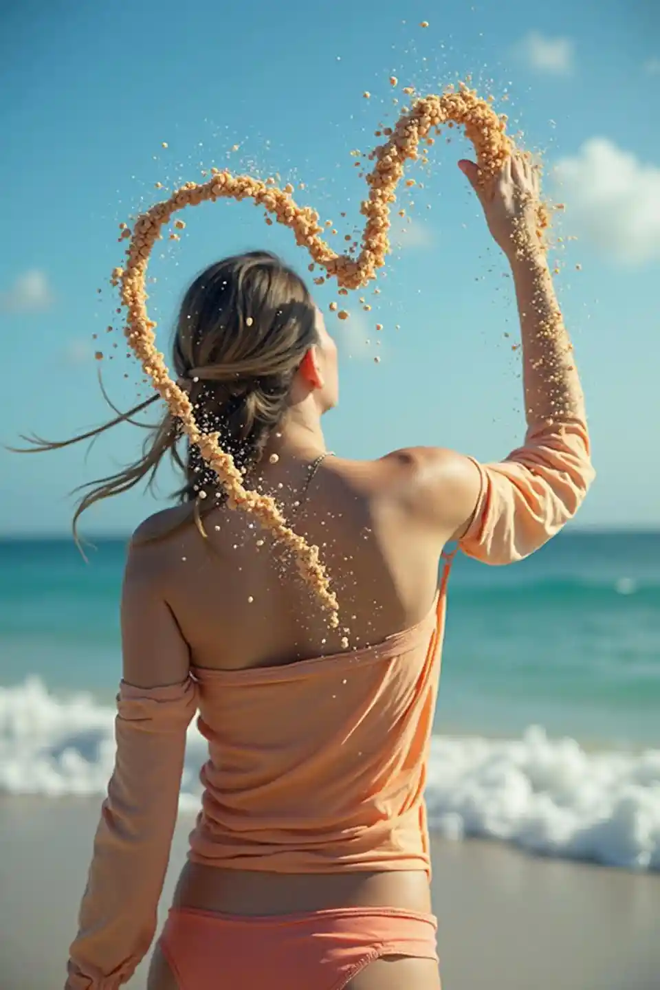 A woman who threw sand into the air,The thrown sand is rainbow-colored and clearly shaped like a heart,unique ocean background,Portrait of a beautiful woman, by